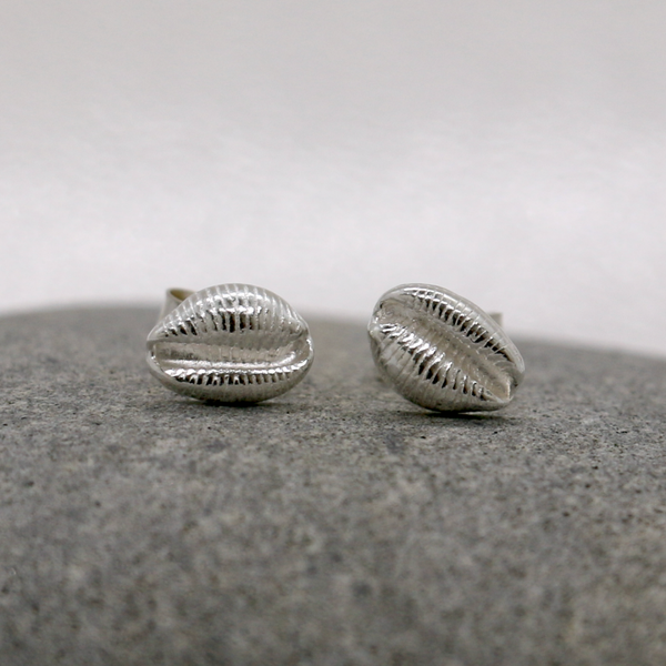 Cowrie shell stud earrings, hand made in fine silver.