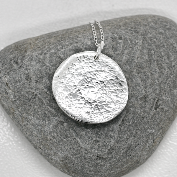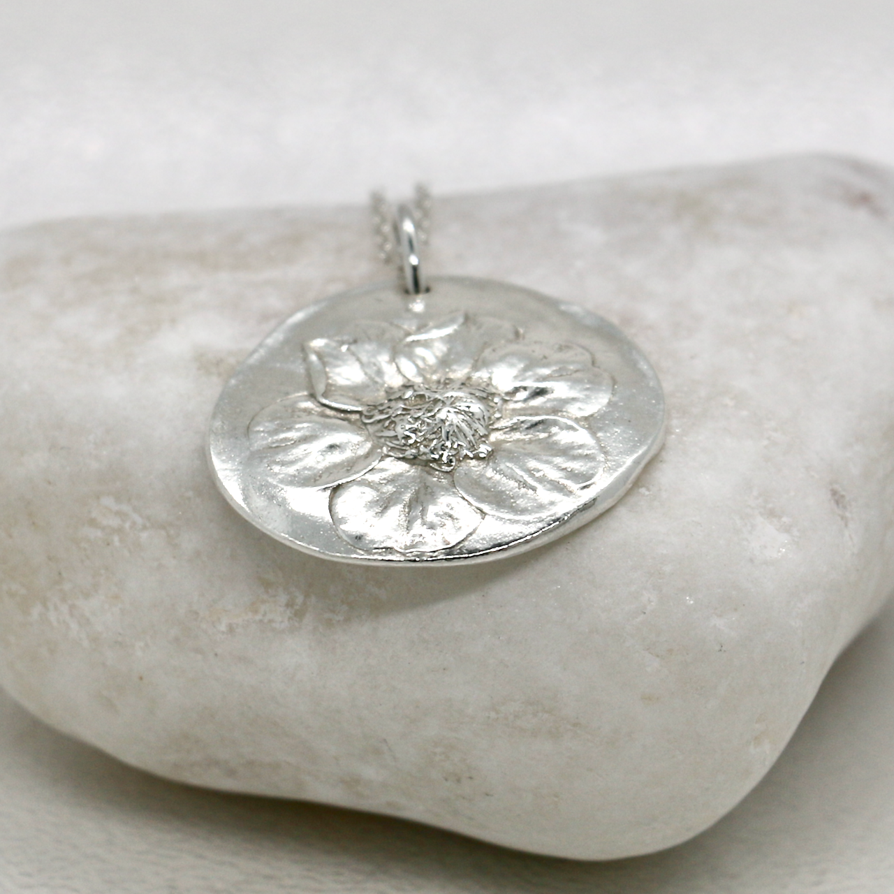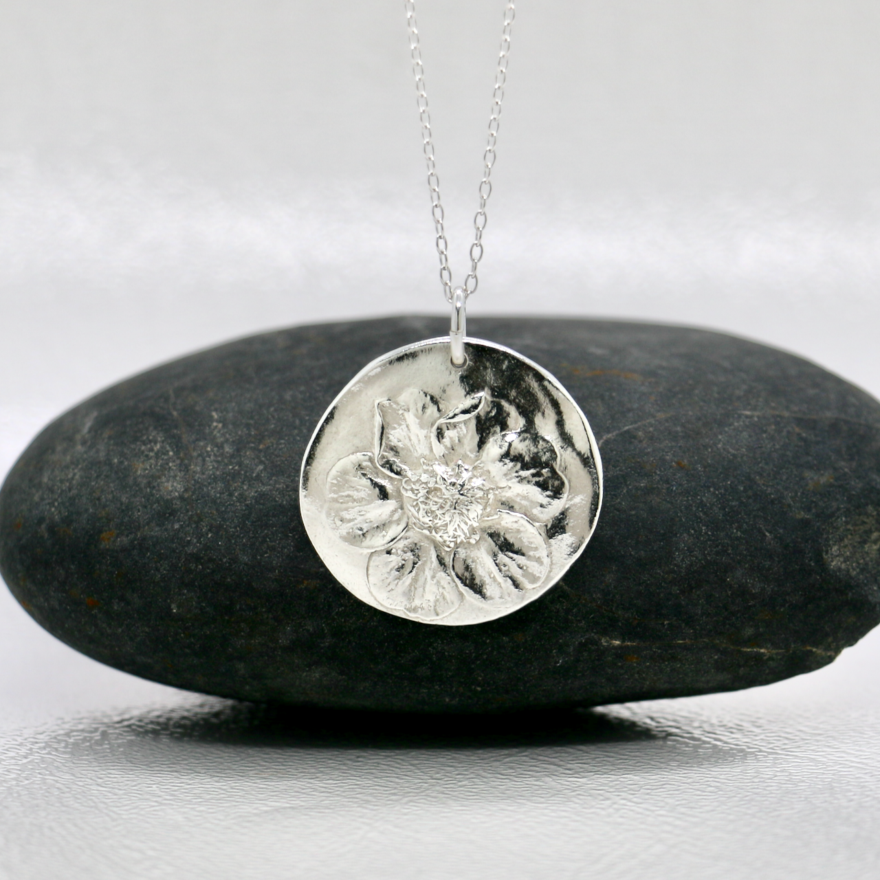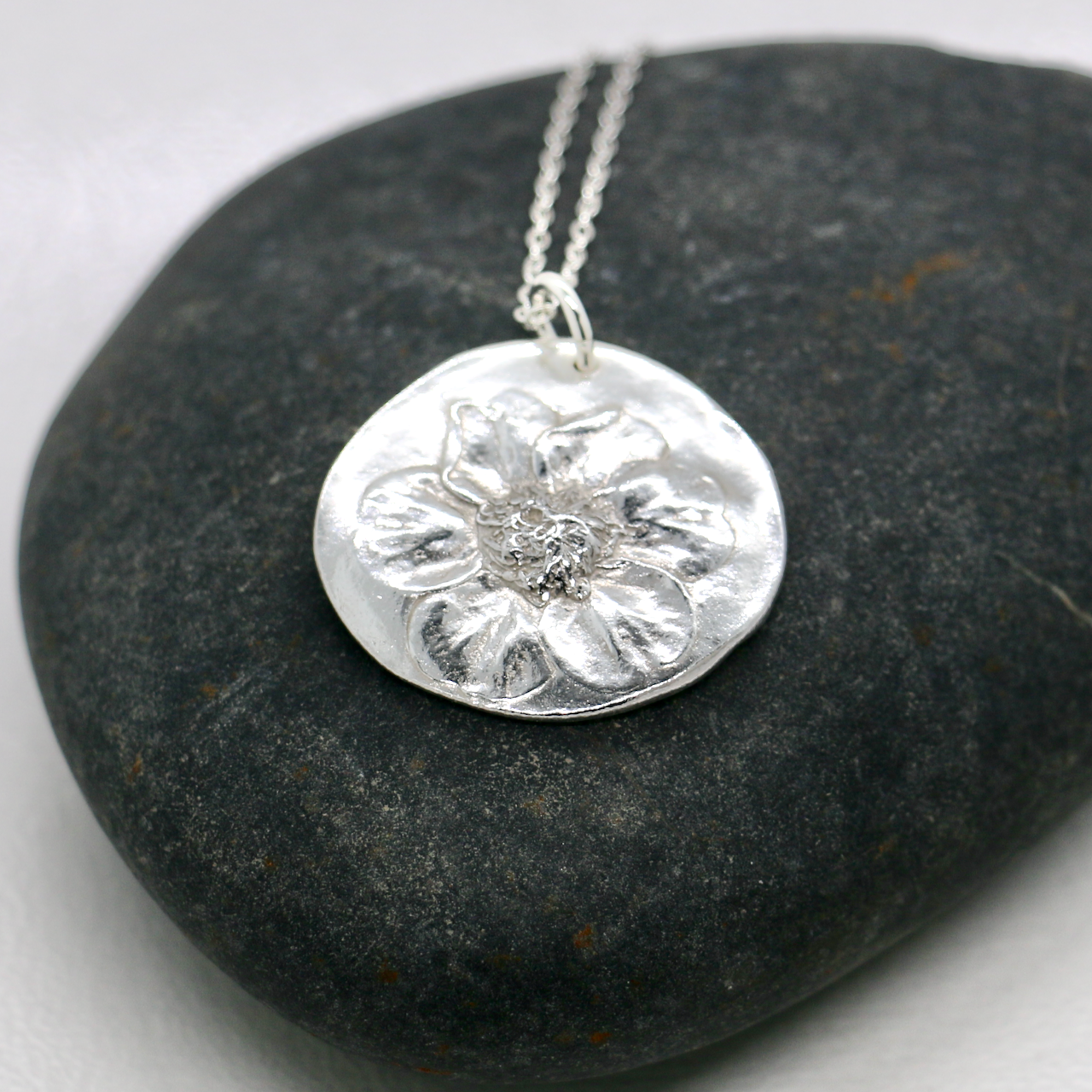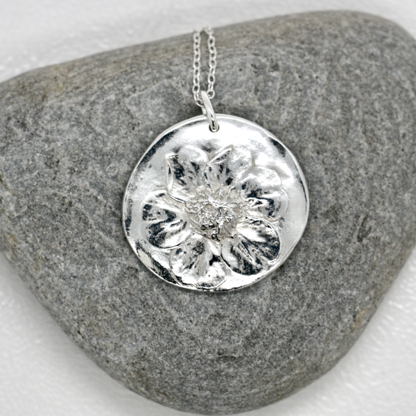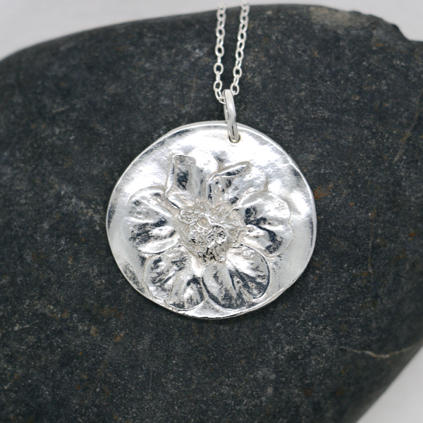 Celebrate the beauty of nature with this handmade fine silver flower pendant, featuring a delicate floral design on an organic shaped pendant made from the imprint of a geum from my garden. Lovingly crafted from 99.9% pure fine silver, this floral necklace captures the joyful spirit of flowers and the timeless charm of minimalist botanical jewellery.